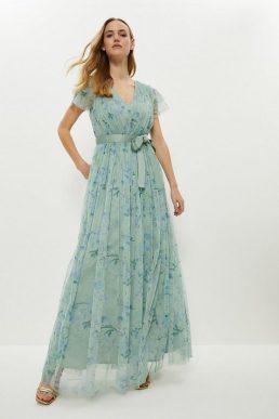 Coast Printed Tulle V-neck Tie Belt Maxi Bridesmaid Dress Green Multi