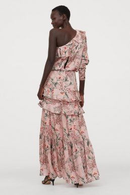 H&M One-shoulder floral satin tiered maxi dress, Pink/Multi