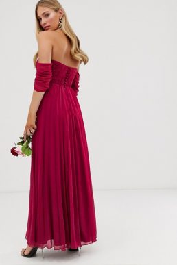 ASOS DESIGN Bridesmaid bardot ruched pleated maxi dress, Winter berry red