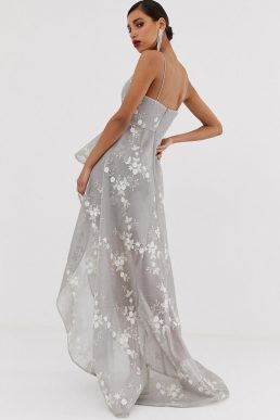 Bariano waterfall mesh maxi dress with floral embroidery in grey