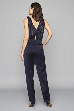 Reiss Margot Satin Sequin Jumpsuit Navy Blue Metallic