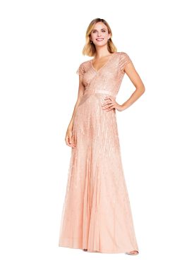 Adrianna Papell Women's Long Beaded V-Neck Dress with Cap Sleeves and Waistband, Blush, 18
