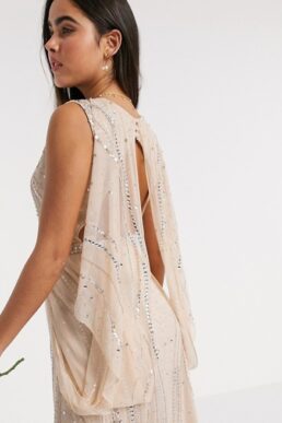 Amelia Rose Bridesmaid embellished wrap cape sleeve maxi dress in rose gold blush