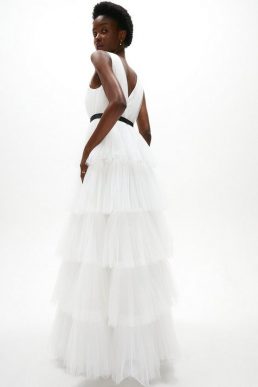 Coast V Neck Tiered Tulle Dress Ivory