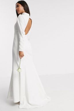 Y.A.S Wedding highneck fishtail dress with embellished cuffs in white