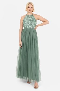 Maya Deluxe Women’s Ladies Bridesmaid Maxi Dress Halter Neck Sequin Embellished Prom Graduation Wedding, Deep Mint, 4