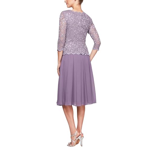 Our T-length, below the knee mock evening dress features a sequin lace bodice, lace illusion sleeves and a solid organza skirt. This is a perfect dress for a mother of the bride, a wedding guest or a special evening event.