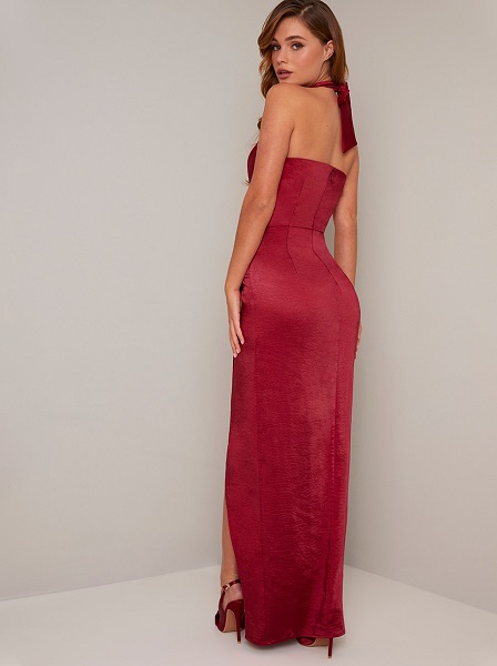 Look amazing in the burgundy Chrytsa Halter Neck Maxi Dress from Chi Chi. The effortlessly chic dress is sure to cause outfit envy at any event! Features: Features; Halter neckline, fitted bodice and side split maxi skirt.