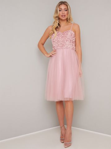The beautiful pink Elia Floral Appliqué Short Bridesmaid Dress from Chi Chi is a guaranteed head-turner, you’ll find this piece as feminine as it is timeless. It features a sweetheart neckline, a stunning applique bodice, a cinched in waist and midi skirt. Perfect for a bridesmaid this season.