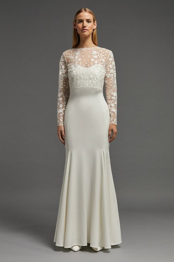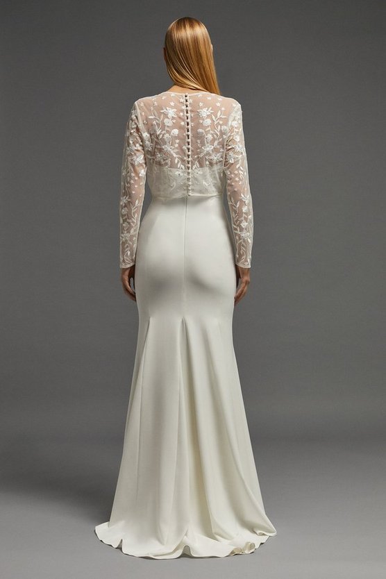 Create a bespoke bridal look with this bridal top. As part of our bridal separates collection, the piece can be worn individually or together with the rest of the collection. Designed in an embroidered sheer fabric, the top features a round neck, long sleeves and split back. Cropped at the waist, it can be paired effortlessly with any silhouette you choose.