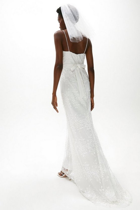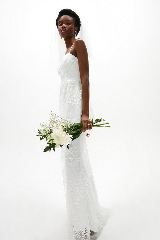 A beautifully designed maxi dress adorned with stunning embroidery. An easy to wear silhouette in white, with sweetheart neckline, cami straps and form fitting bodice creating a flattering fit. A modern bridal dress, perfect for the big day.