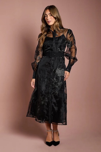 This stunning Coast shirt dress combines timeless elegance with contemporary design. The sheer organza overlay creates a captivating play of texture, whilst the intricate embellishments add dimension and visual interest. The classic collared neckline and button-through front offer a refined touch, beautifully balanced by the dramatic sheer sleeves. Style with pointed court shoes and statement earrings for weddings or race day events. For evening occasions, pair with sleek heels and a clutch bag for an ensemble that conveys sophistication. The belted waist creates a flattering silhouette, making this versatile piece a standout choice for any special event in your calendar where making an impression matters. This dress embodies Coast’s signature occasion-wear excellence, designed for the woman who appreciates refined craftsmanship.