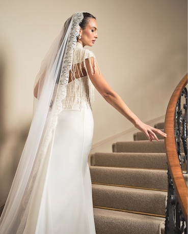 • Exquisite pearl embellishment with dramatic fringe detail across the bodice