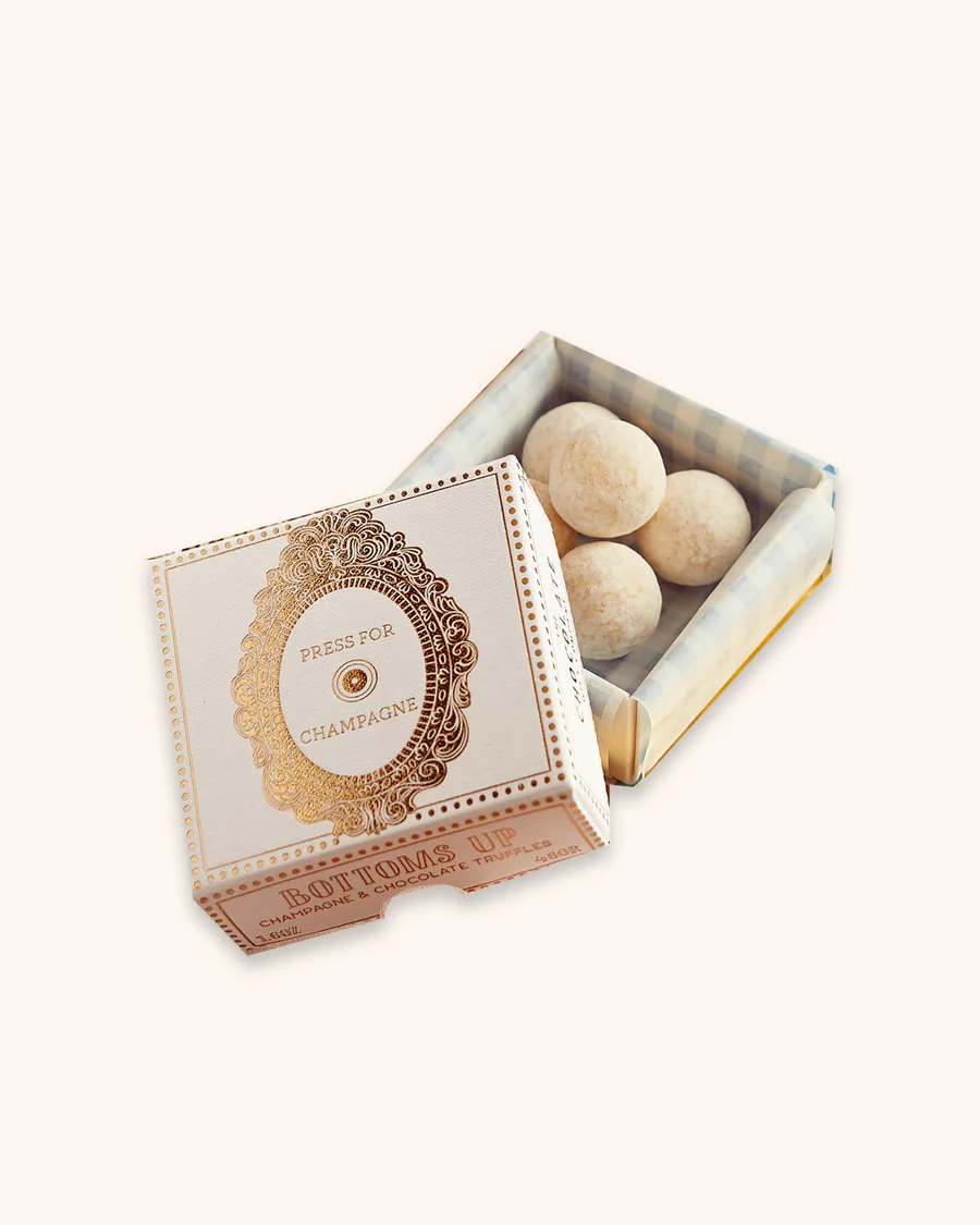 Five Marc De Champagne and White Chocolate Truffles. Presented in a decadent box embellished with gold foil. The perfect item for Valentine’s Day or even to pop in your Bridesmaid Gift Box.