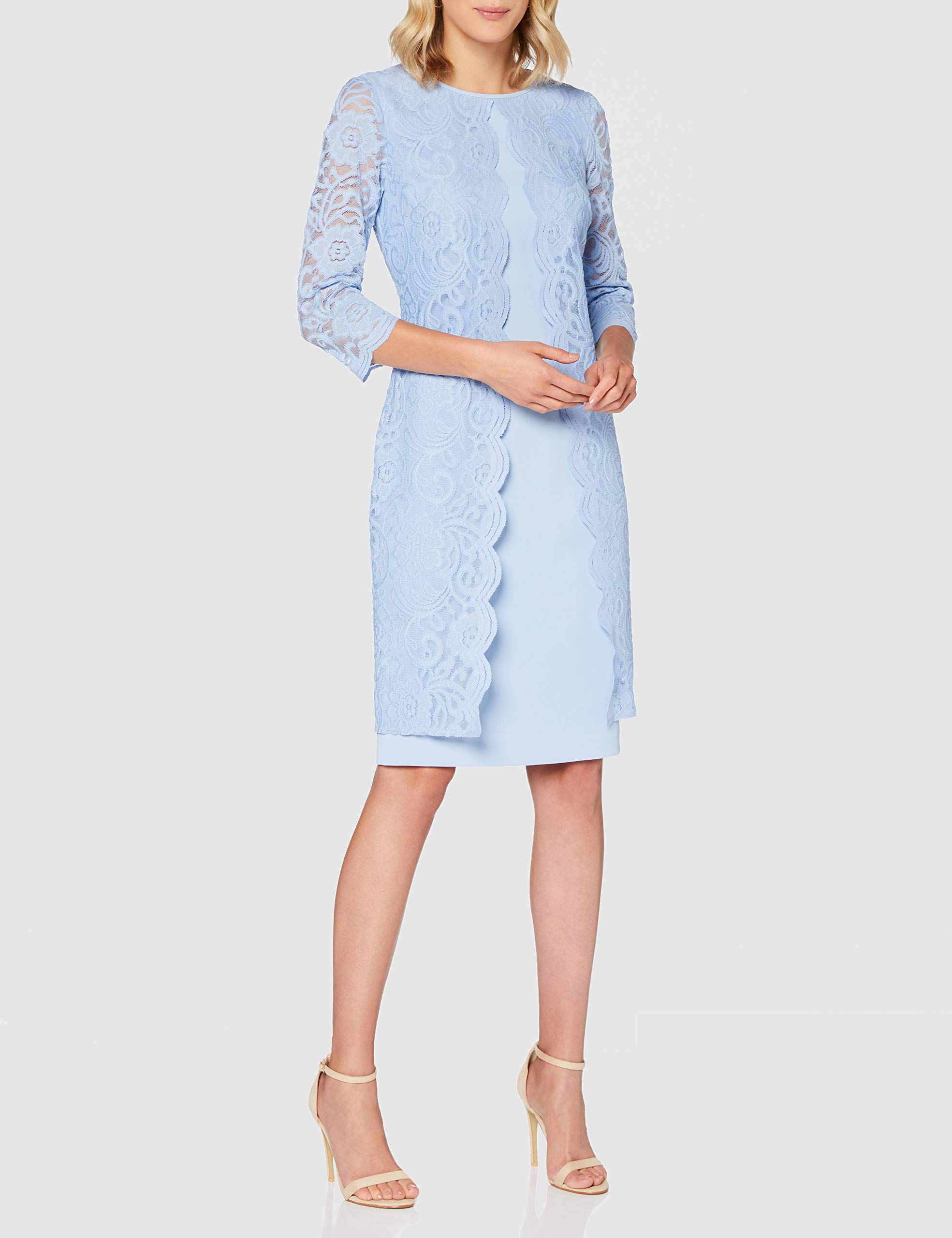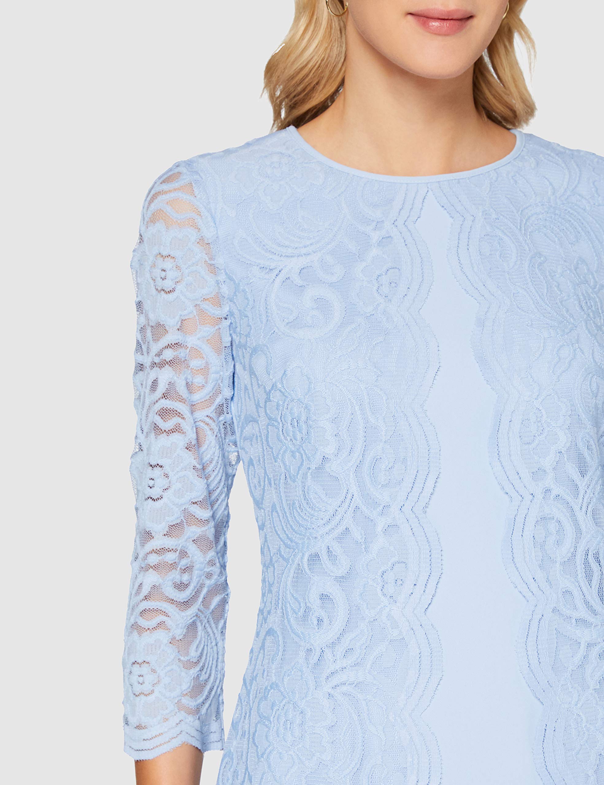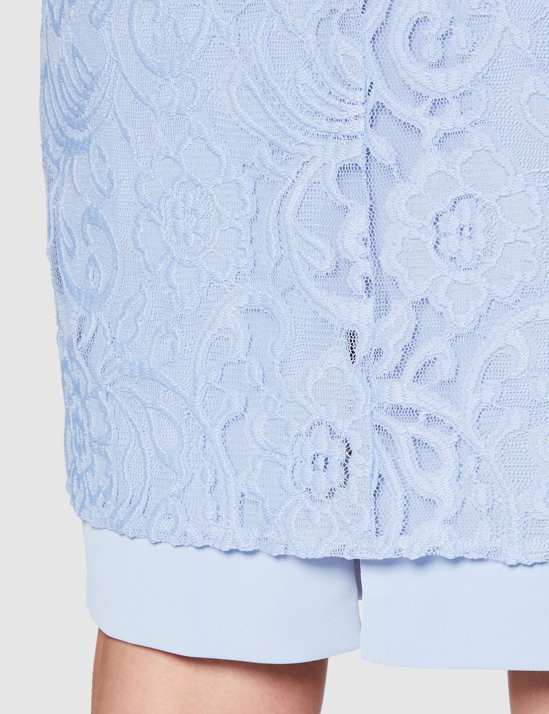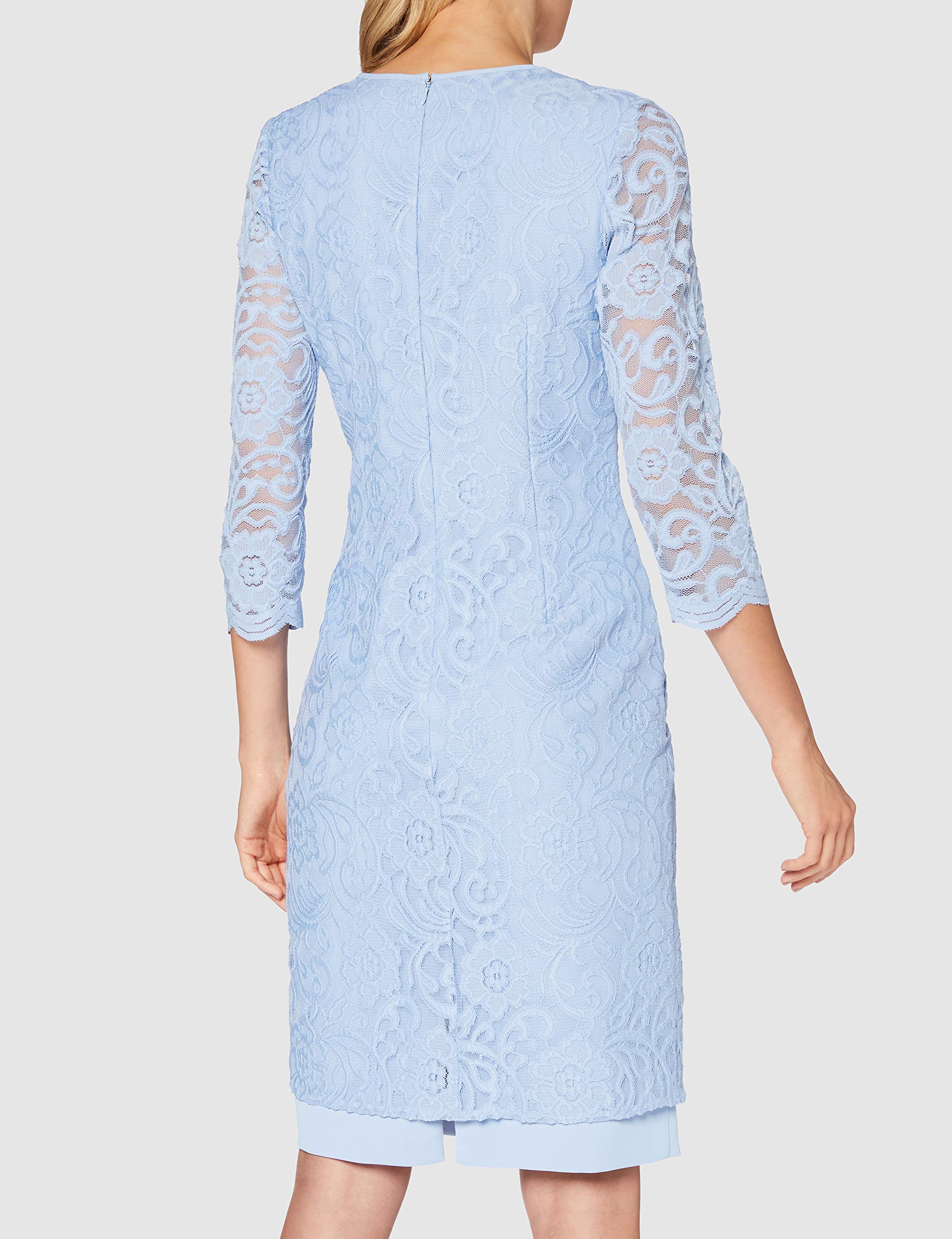 Gina Bacconi presents its stunning crepe and lace dress. This perfect occasion wear piece is comprised of a classic shift dress overlaid with a dainty floral lace. The lace features a scallop lace which adorns the front of the dress and the sleeve edge. The