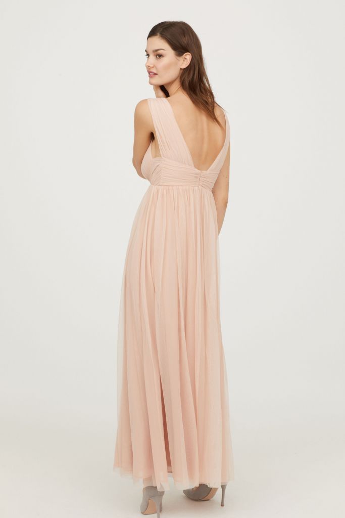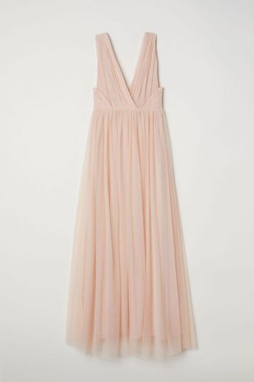 The stunning mesh powder pink maxi bridesmaid dress from H&M features a deep V wrap neckline, a cinched in waist and a beautifully flattering floor sweeping skirt. This maxi dress is the ultimate show stopper for any wedding.
