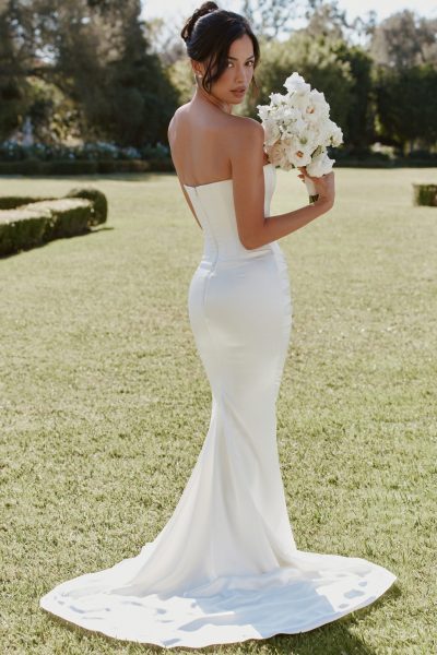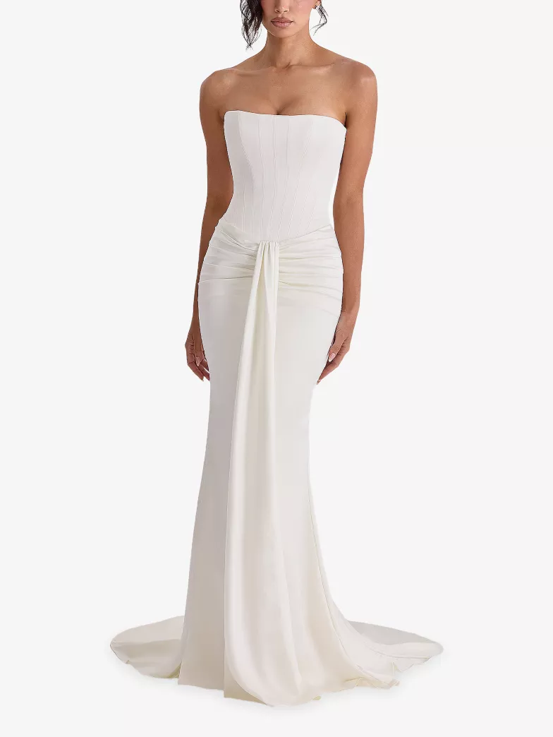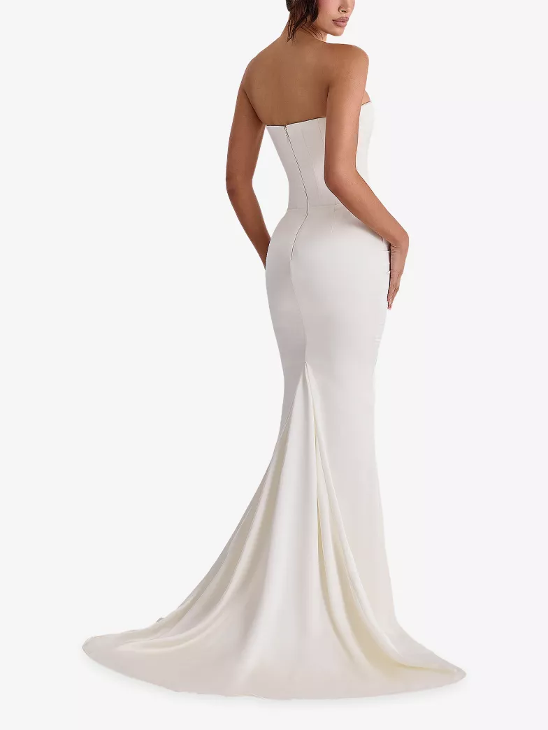 Slim fit, strapless, fully boned bodice, concealed interior straps for support, draped front, maxi length, train at back, duchess satin lining.