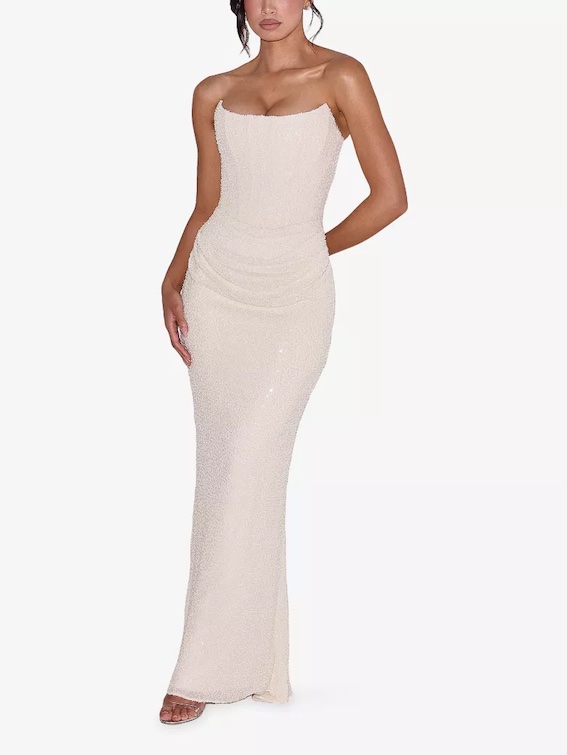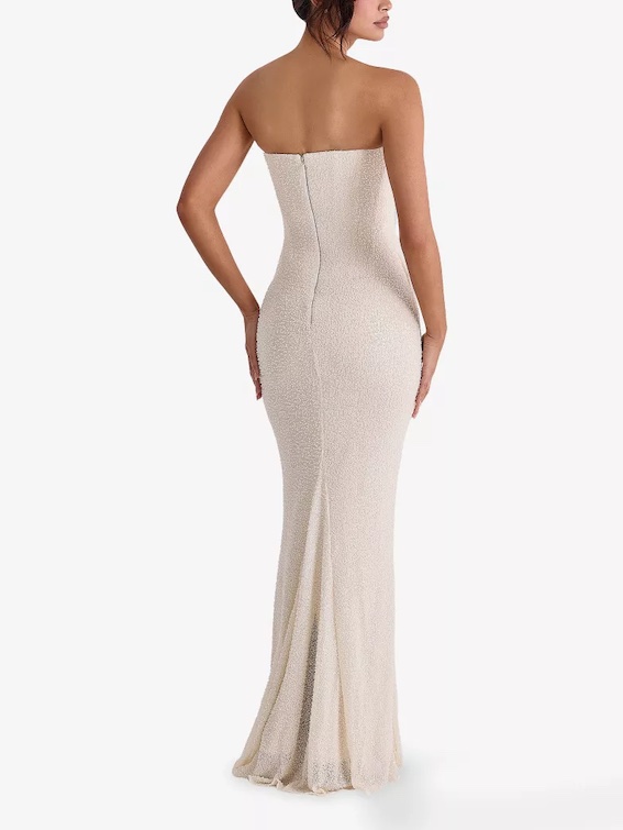 Slim fit, peaked neckline, strapless, bonded bodice, concealed interior support, all-over bead embellishments, gathered front, maxi length, crepe lining