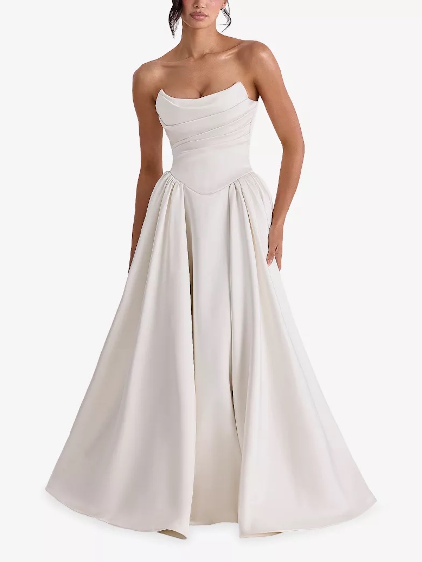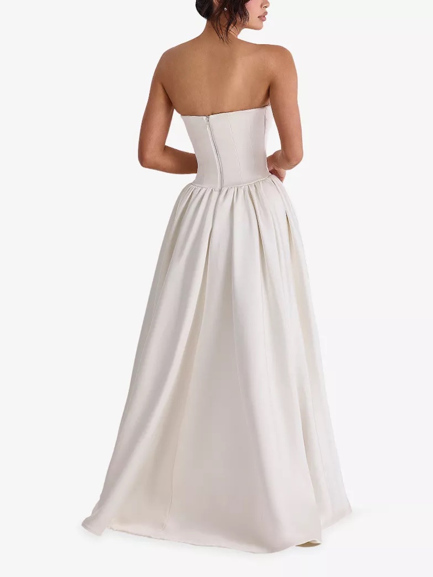 Slim fit, peaked neckline, strapless, draped bodice, boned bodice, concealed interior bust support, dropped waist, flared skirt, concealed tulle lining