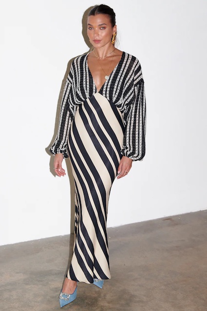 A heavy glossy satin maxi, with a matching crochet top. We love the contrast in texture, and the crochet adds a beachy feel so it can be taken through spring summer. With dramatic blouson sleeves, a V neckline and a body skimming silhouette. Pair with a heel for summer weddings, or a sandal for vacation.