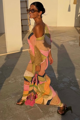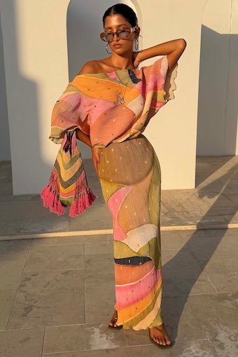 Designed in-house, our bestselling metallic fleck print featuring gold brushstrokes, that are highlighted by the sunlight, on a super chic abstract print. A fitted skirt with a slightly more voluminous top, it gives the most perfect shape for vacations, parties or summer weddings.