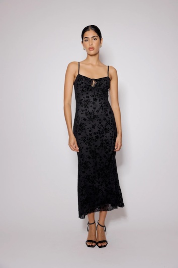 This black midi dress is cut from floral devoré velvet with a luxe feel. It has a soft milkmaid neckline with a keyhole tie, adjustable straps for the perfect fit and falls to a slim silhouette.
