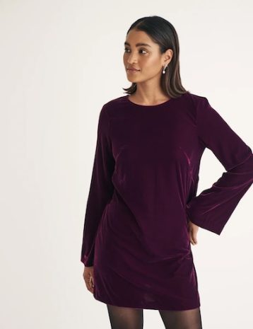 Your new favourite party dress. Finished with 70s-inspired fluted sleeves and an open back, our burgundy Jolene mini is the answer to every invitation this fall. Turn around to show off the statement bow.