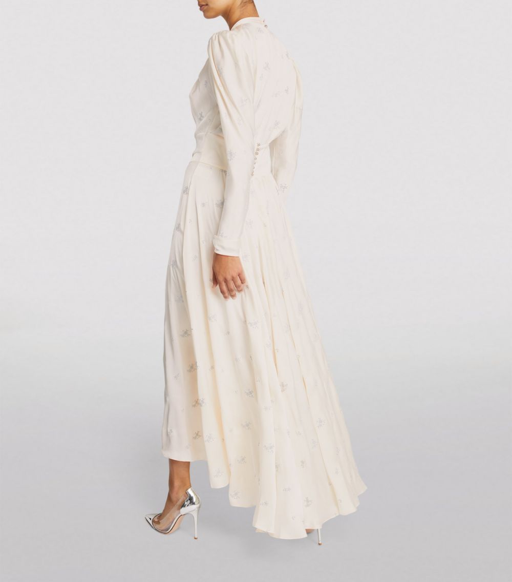 Despite its beginnings as a pioneer of futuristic fashion in the 1960s, Paco Rabanne isn’t afraid to look back through the archives to create its modern-day collections. This vintage-inspired satin gown is infinitely elegant, thanks to its draped silhouette and floral embroidery. The only nod to its designer’s irreverent heritage is the powerful padded shoulders.