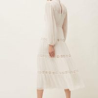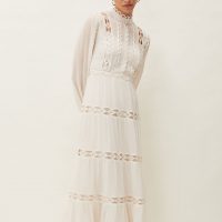 It was love at first sight. Our beautiful Amberlee dress is full of feminine details and charm. Cut to a universally flattering midi length, this style features delicate cutwork borders through the skirt and bodice, and is framed by long semi-sheer blouson sleeves and a high neckline. This dress is perfect for wedding guests, garden parties or even for the modern bride who wants to wear something a little different for her big day.