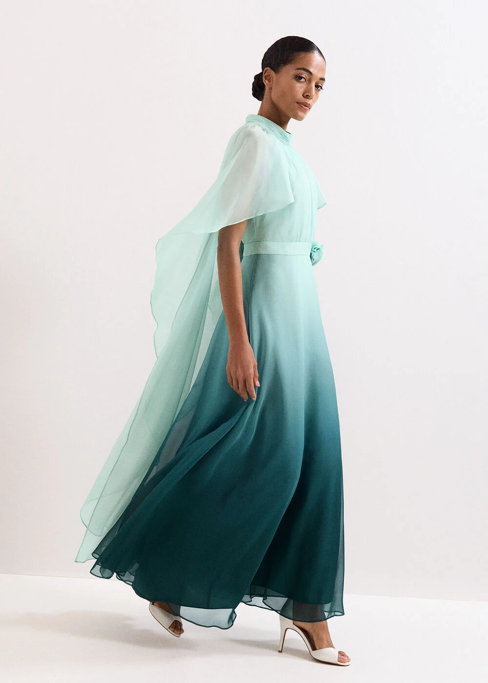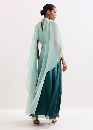 A dress so memorable, they’ll be talking about it for years to come. The Aspen dress is designed in a romantic maxi silhouette, in a striking yet feminine teal ombre. With a beautifully elegant high neckline and ruched bodice, the key design detail is the attached sheer cape that adds soft statement to the style. Finished with a flower applique to the waistline, this dress is perfect for all your special occasions this season.