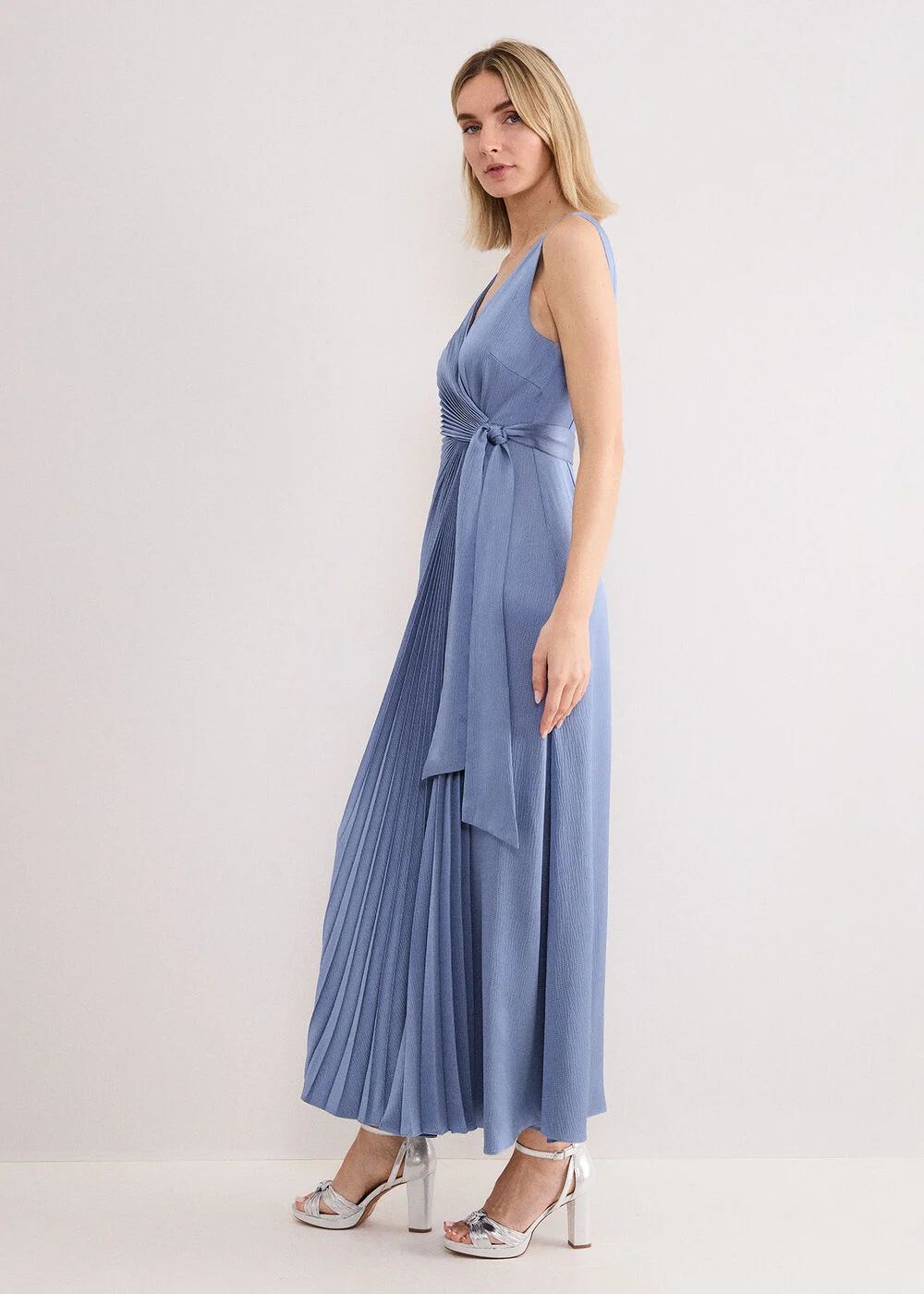 Radiating pure elegance and sophistication, this soft blue satin maxi dress will turn all the heads. The wrap bodice beautifully drapes with complementary pleating on one side; these details add refinement to the luxe silhouette. Style with your favourite heels and clutch to finish the look.