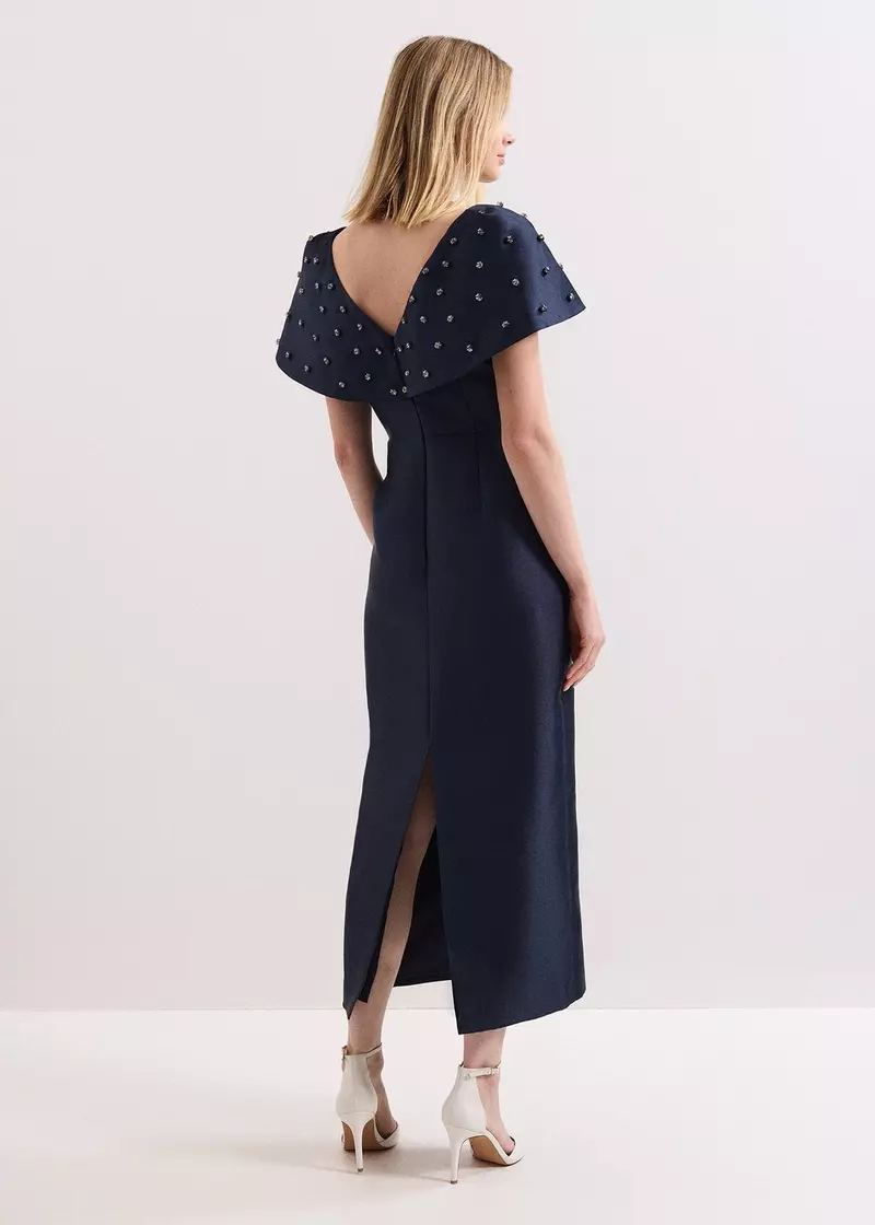 Sensuous and sculptural, meet the Erina dress. Designed in a luxurious navy satin, this event midi dress features a high-impact cape style collar with considered embellishment for an elegant touch. With expertly placed darting to the bodice and a structured skirt for a vintage-inspired tailored fit, this dress is guaranteed to wow at your next event. Style with neutral or matching accessories to finish the look.