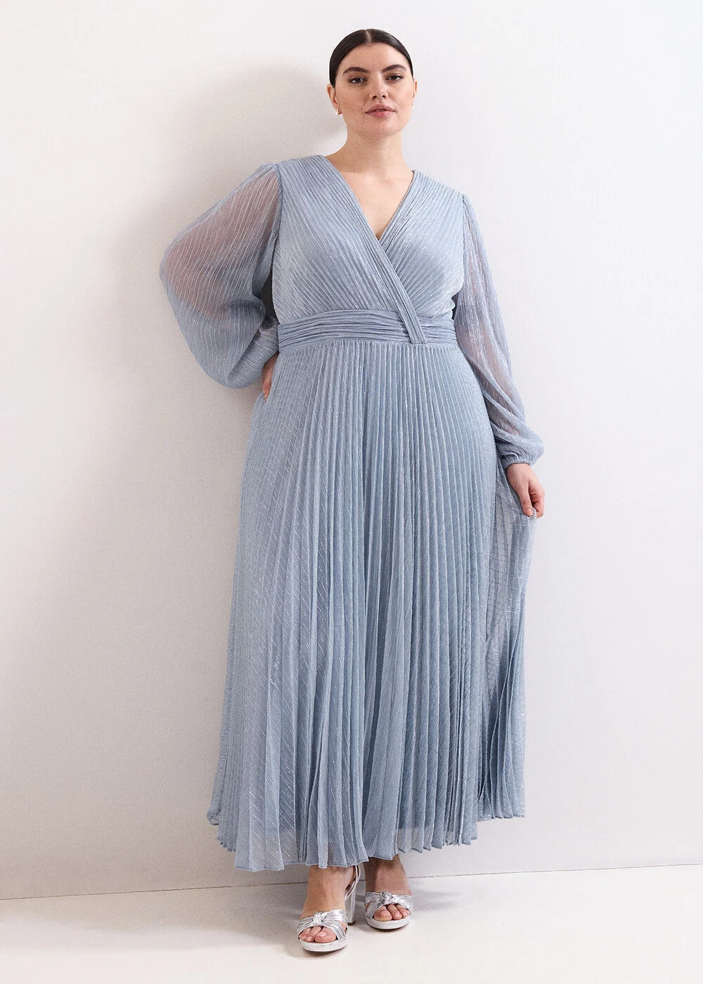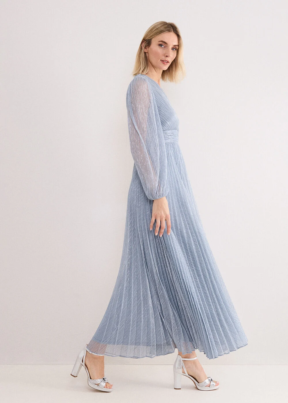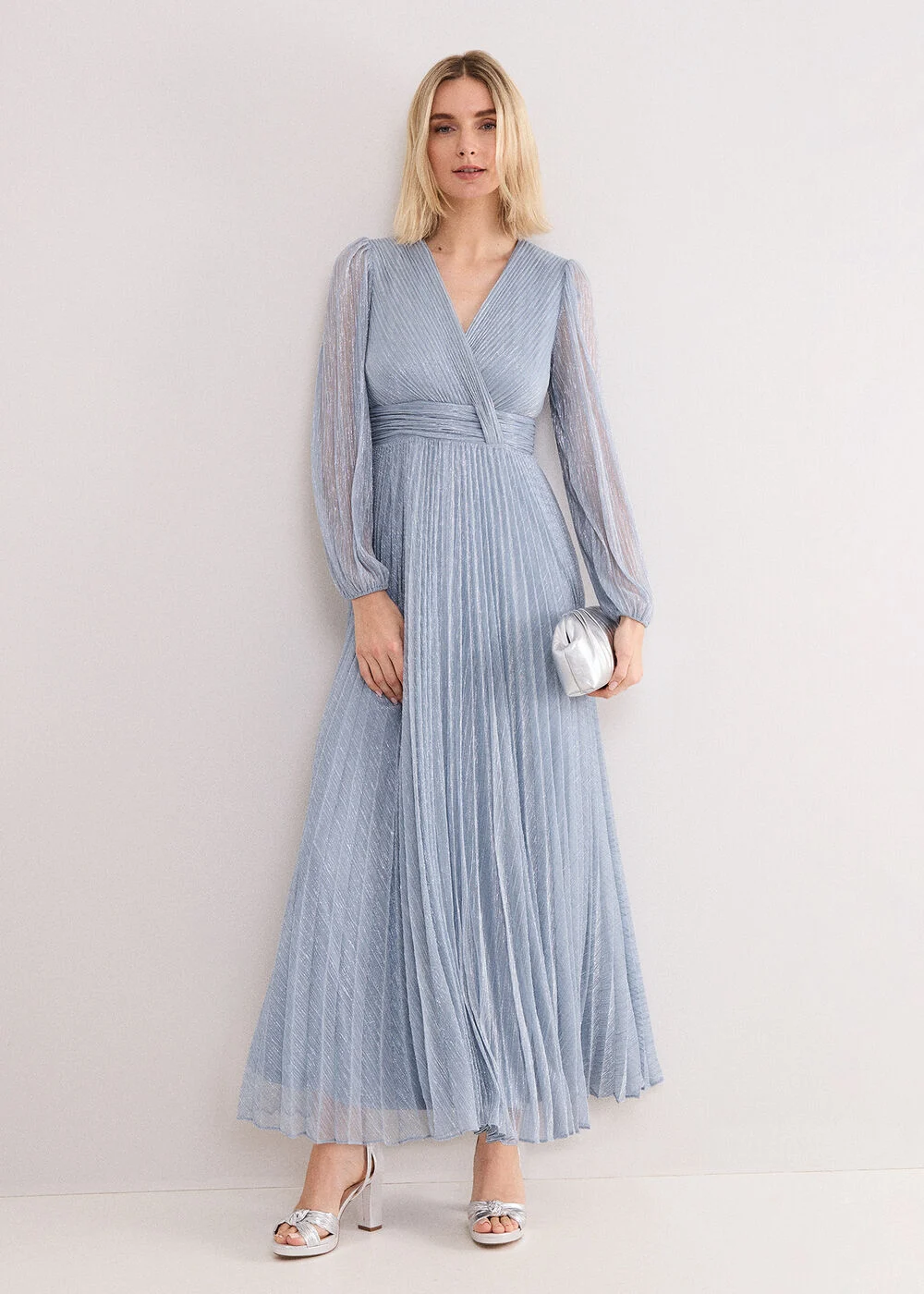 Our Harper maxi dress makes for an effortless statement. In a pale blue shade, this dress features feminine details, including blouson sleeves and a faux wrap bodice, it is an elegant event style. The delicate pleats are interwoven with subtle silver shimmer, perfect for a modern bridesmaid look.