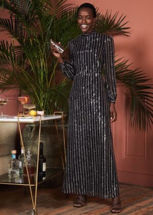 A stand-out maxi dress that’s top of our partywear wish lists. This shimmer style has a modern stripe throughout, plus a contemporary high neckline and soft blouson long sleeves.