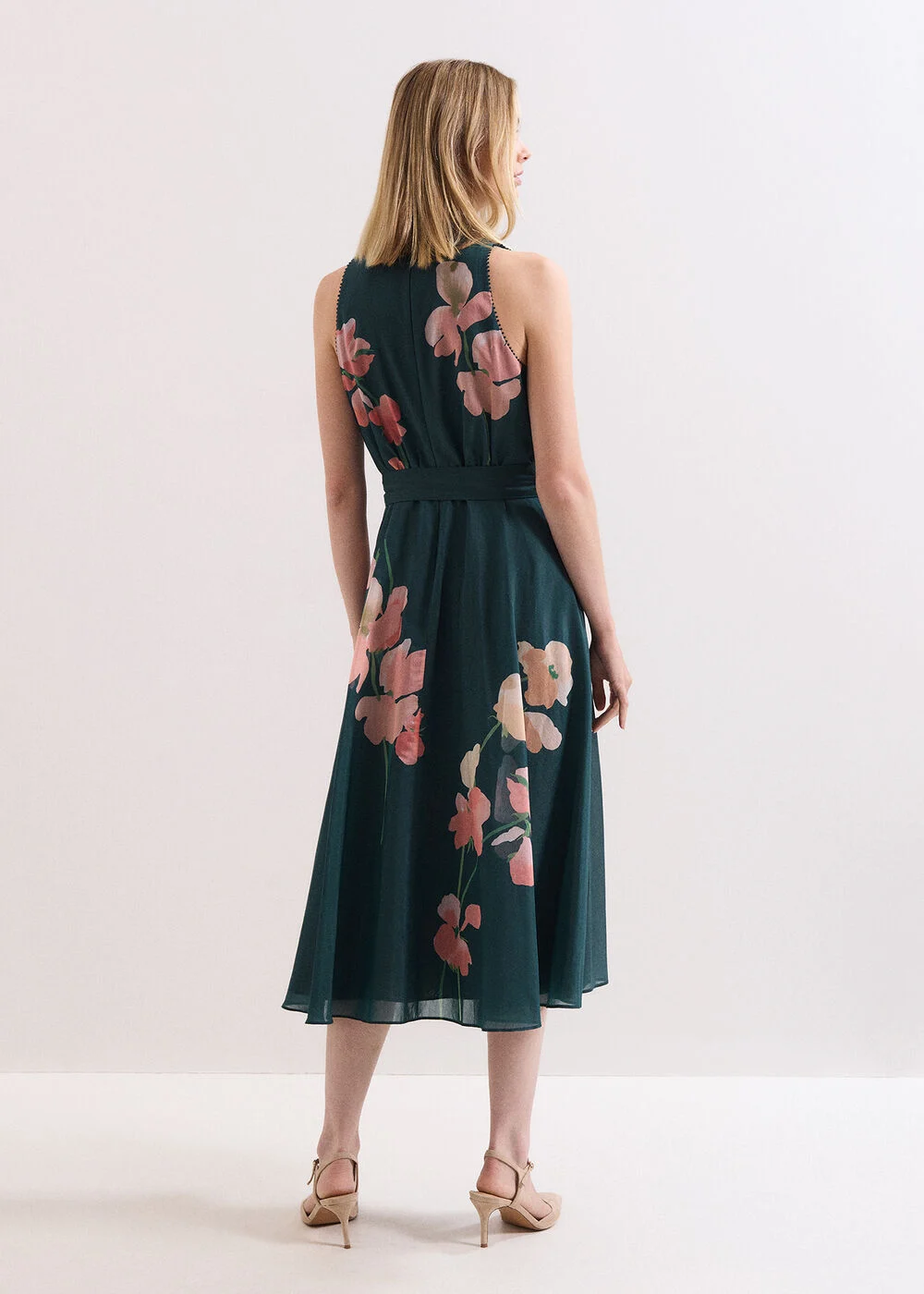 The perfect dress for all your spring/summer occasions. This dark teal midi dress is designed in a feminine A-line silhouette and is adorned with a beautiful hand-painted pink floral print, capturing the essence of the new season. Featuring elegant, covered buttons, a matching tie belt and a subtle ruched bodice. Style with your favourite neutral accessories to complete your special event look.
