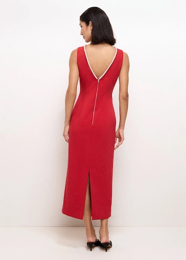 Nothing says confident dressing like a red dress. Ours is defined by a distinctive embellished diamante trim at the keyhole neckline that adds an effortless glamour. Finished with a side split that for an elevated and modern sensibility, it’s the perfect choice for events where you want to make sure all eyes are on you.