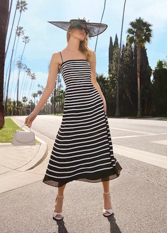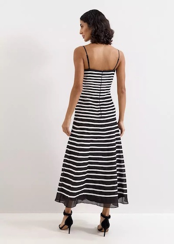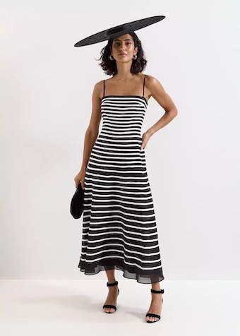 Part of our Limited Edition collection, designed for the bold, confident woman. In a striking monochrome stripe print, this standout midi dress is designed in a timeless A-line silhouette, with a modern square neckline and thin, removable straps for versatile ways-to-wear. Style with matching shoes and bag for an event look you’ll love, invite after invite.
