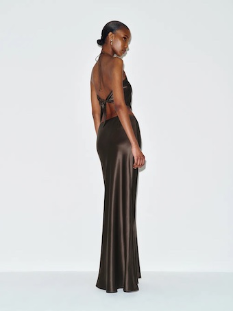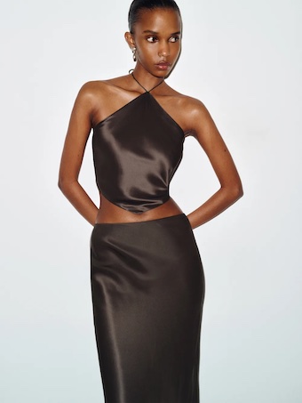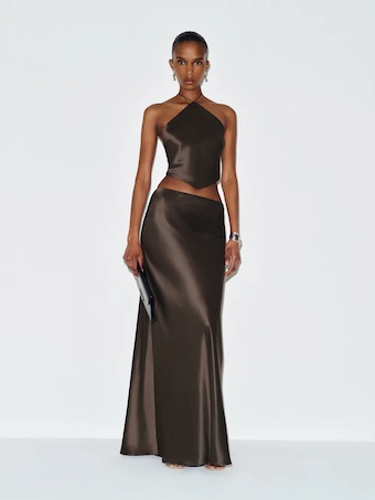 Meant for each other. The Effie Silk Two Piece is a halter top with a tie neckline and a matching maxi skirt. Pretty much comes with built-in styling.