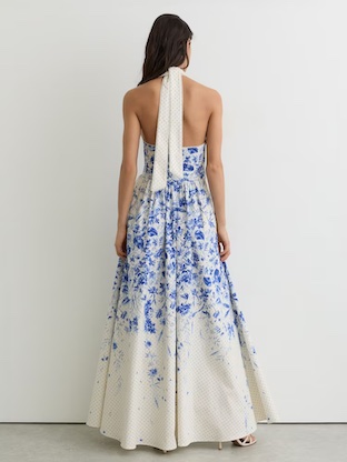 The Amaya dress is cut from cotton with subtle stretch in a delicate floral print. A crossover halterneck, waist belt, and full maxi skirt create an elegant silhouette.