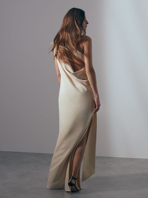 Cut from a flattering stretch-enhanced fabric into a one-shoulder shape, this dress drapes down the back to a floor-length finish. A cross-back strap secures the wear and cascades down the side for added movement.