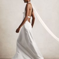 Crafted from luxurious duchess satin, the Brackley dress exudes modern bridal elegance with its fluid, weighty drape that shapes a refined silhouette. Ruffled side panels and flowing draped sashes at the back add drama, while the low back with a buttoned strap enhances its timeless sophistication.