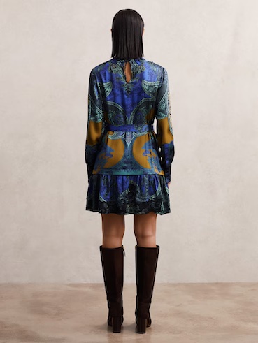 The Kaisley dress is patterned with a vibrant paisley print that enlivens its flippy mini silhouette. A drawstring-tied high neckline and blouson sleeves add soft volume, while a self-tie belt cinches the waist for definition. Paisley print. High neckline with tied back. Keyhole detail. Self-tie belt. The model is wearing a size 8. Measurements of model: height 5ft 9″ / 175cm.