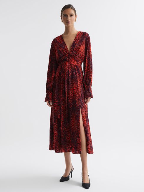 A vibrant, red animal print features the maya dress, making it a stand-out pick for your special occasions. It’s cut with a v-neckline and a front slip, which tastefully showcase the frame. Long blouson sleeves are added for a dynamic silhouette. opt for black accessories to complement the edit.