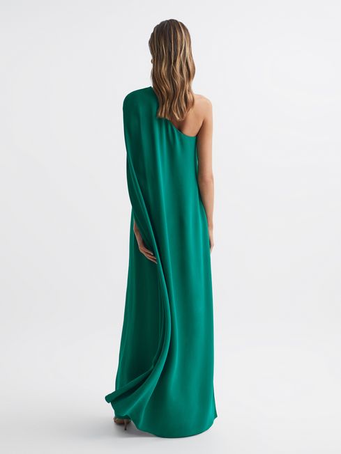 Make a statement with the Nina dress in green. Its asymmetric neckline combined with the cape-style single sleeve presents a lavish look with voluminous tones. Cut to a maxi-length and crafted in a delicately flowing fabrication, this dress is designed to streamline the silhouette.