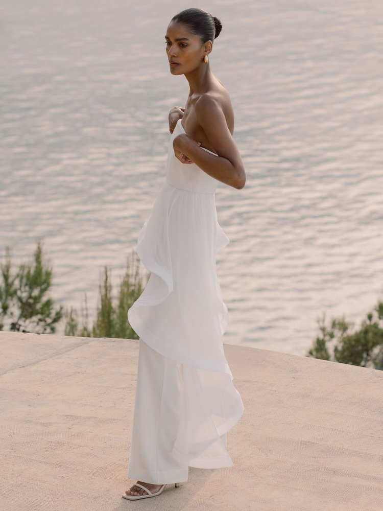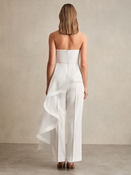 The Rhiannon Jumpsuit is crafted from silk with a fitted bodice and a bandeau neckline, flowing into wide legs for a clean, elegant silhouette. It’s overlaid with a sheer, asymmetric ruffle that cascades down one side, structured with a defined trim to add drama and movement, 100% silk. Structured asymmetric ruffle. bandeau neckline. wide leg. front pintucks. concealed zip to reverse.