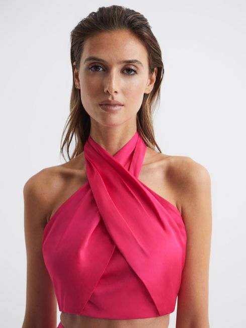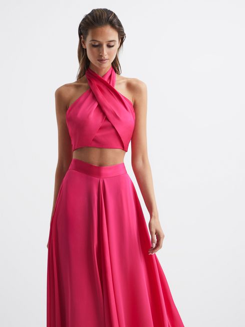 The pink Ruby top is cropped at the waist and features a cross-over halter design. It wraps across the chest and ties in a bow at the reverse, for an alluring open-back finish. Style with heels and the matching ruby maxi-skirt for an elegant occasionwear edit.