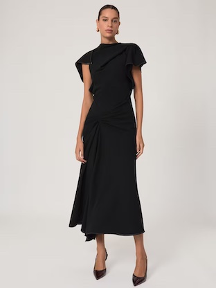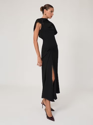 Asymmetric draping and ruched detailing at the waist create soft ripples through the Saskia dress. Contrast topstitching subtly frames the silhouette, while mismatched flounce sleeves and a side slit enhance its sense of movement.