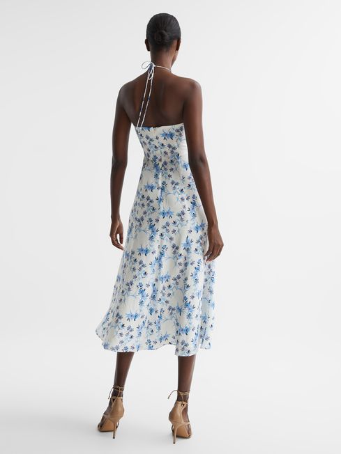 Update your smart-casual rotation with a dainty printed element. The Sophia dress is fitted with a self-tie halter neckline, and a cut-out element accentuates the chest. A front slip is featured to the midi length for an amorous feel. Style with heels to elevate the look.