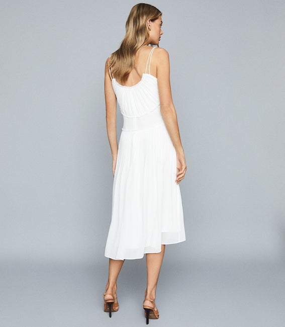 The gorgeous Thora dress from Reiss in white is the perfect dress for all manners of formal invites in spring. Crafted from chiffon, this style is detailed with pleats and ruffled trims. Style it with metallic sandals and coordinating jewellery to complete your look.