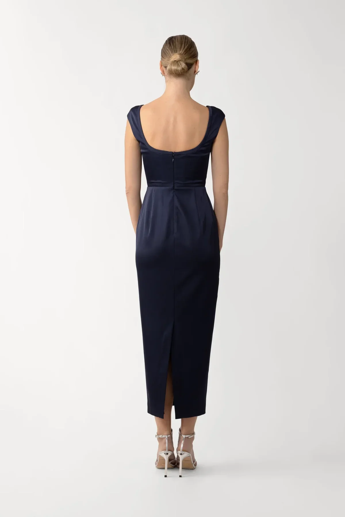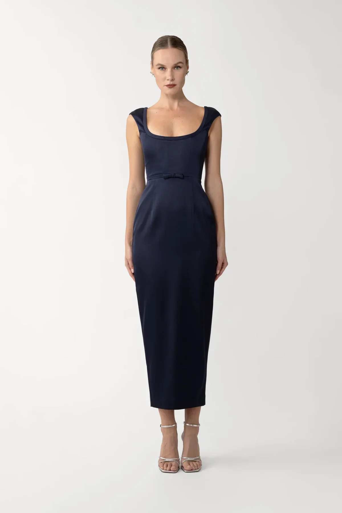 The Meadow Dress is cut from lustrous satin in a fitted midi silhouette. Featuring a soft scoop neckline and subtle cap sleeves, it’s finished with a delicate bow at the waist for a romantic touch.